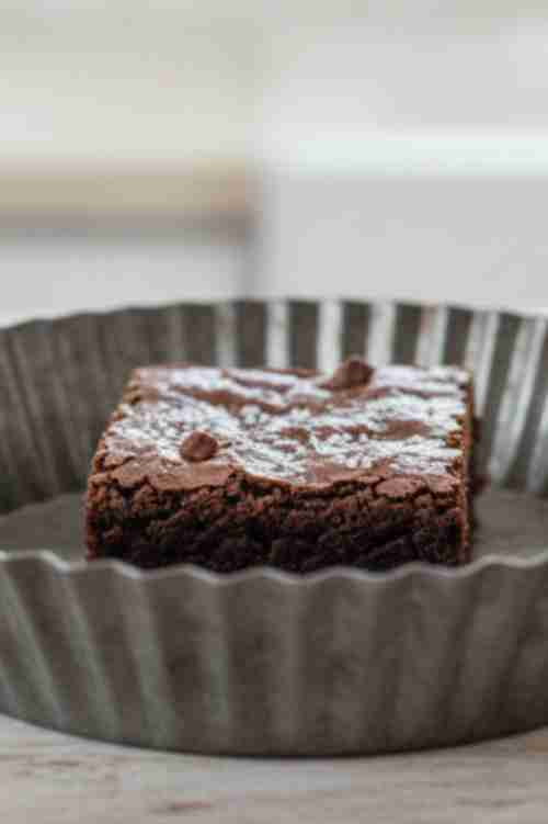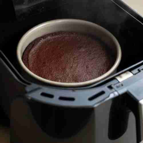 Use a small heat-safe dish that fits in your air fryer basket. Spray it lightly with oil or butter so the brownie does not stick. I always forget this part and regret it, trust me.