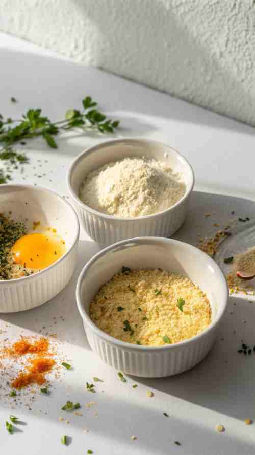 Grab three shallow bowls. Put the flour in one. Beat the eggs in another. Then mix the panko breadcrumbs, garlic powder, paprika, salt, and pepper in the third. This is where the magic happens.