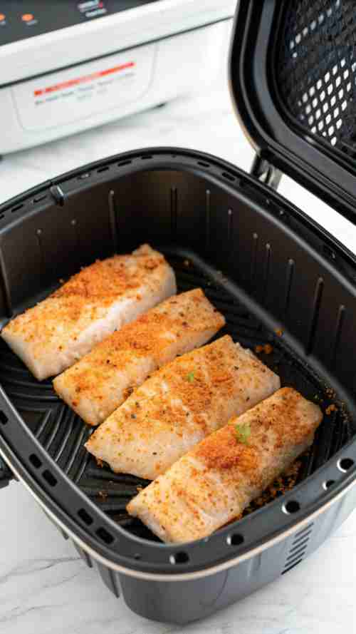 - Place the fillets in the air fryer basket in a single layer. Do not overcrowd them. Air fry at 400°F (200°C) for about 10 to 12 minutes, flipping halfway through. The fish should be golden and flaky when done.