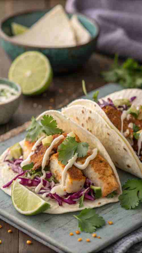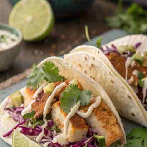 Now the fun part. Add a few pieces of crispy cod to each tortilla. Top with shredded cabbage, a drizzle of creamy sauce, a sprinkle of cilantro, and a squeeze of fresh lime. Every bite is crunchy, tangy, and full of flavor.