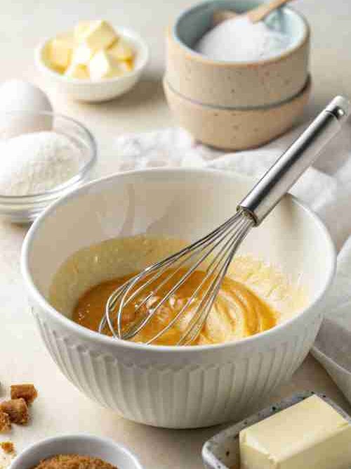 - In a bowl, whisk melted butter and sugar until smooth. Add eggs and vanilla extract. Mix until glossy and silky.