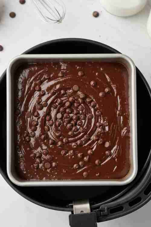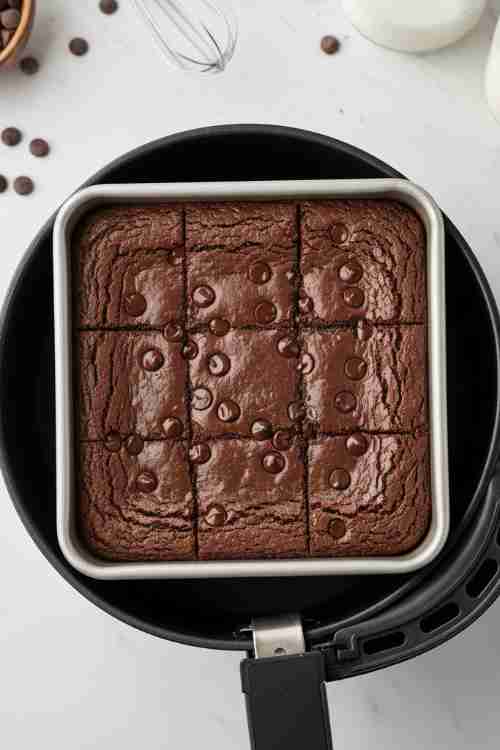 - Set air fryer to 320°F (160°C) and bake for 15–18 minutes. Insert a toothpick in the center to check. Moist crumbs = perfect fudgy brownies.