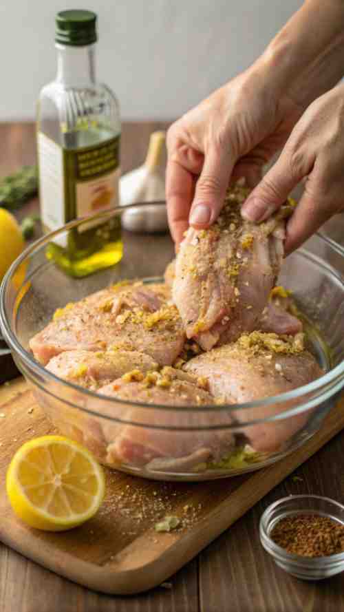 - In a bowl, mix olive oil, lemon juice, garlic, lemon zest, and all the spices. Rub the seasoning all over the chicken thighs and let them sit for at least 10 minutes.