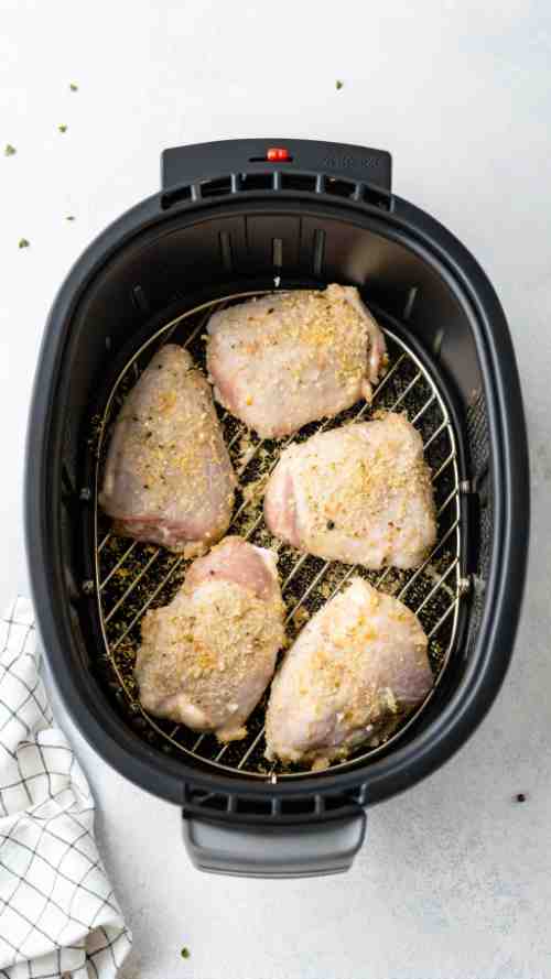 - Do not overcrowd the air fryer basket; give each thigh space to crisp up.