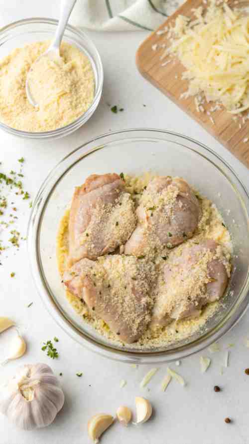 - Add the chicken thighs to the bowl and toss until each piece is fully coated in the cheesy garlic mix.