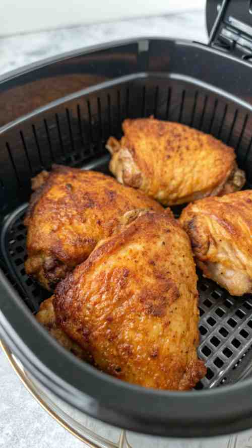 Preheat your air fryer to 400 degrees Fahrenheit. Place the chicken thighs in the basket skin side down. Cook for 12 minutes, then flip and cook another 10 to 12 minutes. Check that the internal temperature reaches 165 degrees Fahrenheit. The skin should be golden and crispy.