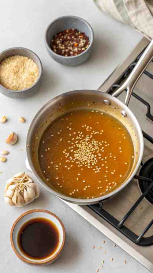 - While the chicken cooks, combine honey, soy sauce, sesame oil, rice vinegar, and minced garlic in a small saucepan. Heat over medium until it starts to bubble. Add the cornstarch mix if you want it thicker. Stir until smooth and shiny.