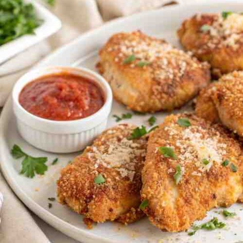 Take the chicken out and let it rest for a few minutes before serving. This helps keep all the juices inside. I like to squeeze a little lemon juice on top or serve it with marinara sauce for dipping.