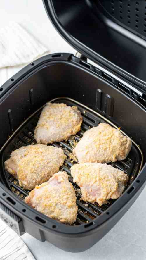 If your chicken thighs are not getting crispy, it might be because there is too much moisture. Make sure to pat them dry before coating them, and do not overcrowd the air fryer basket. Air needs to flow around the chicken to make it crispy.