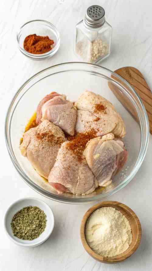 - Mix olive oil, ranch seasoning, garlic powder, onion powder, and paprika. Rub all over the chicken thighs until fully coated.