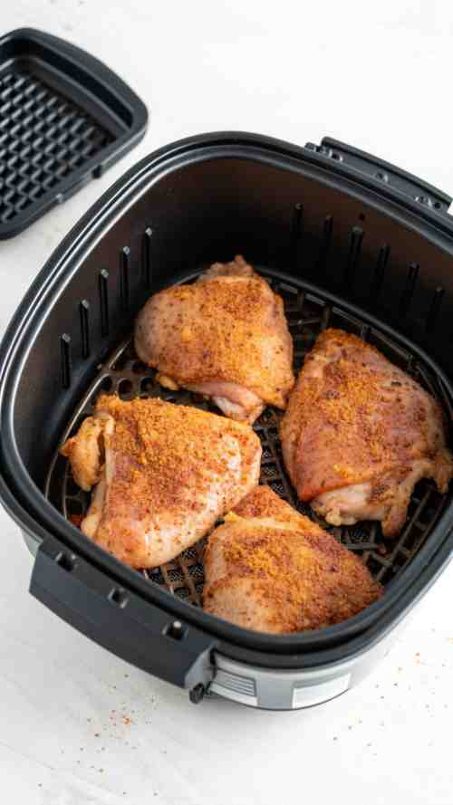 Place the chicken thighs skin side down in the basket. Cook at 380°F for about 12 minutes. Then flip them and cook another 10 to 12 minutes.