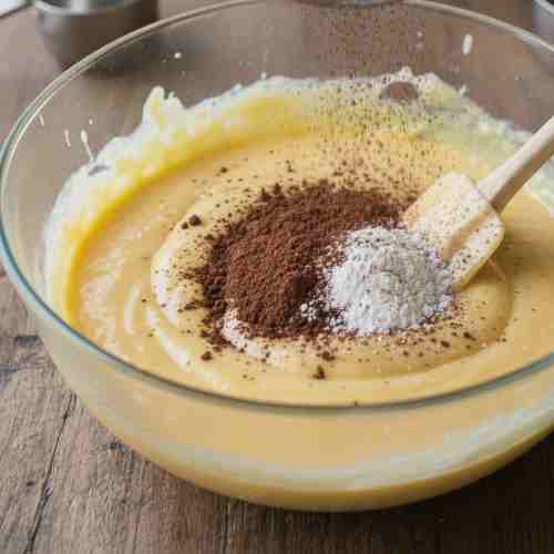 - Fold in cocoa powder, flour, salt, and baking powder gently. Do not overmix.