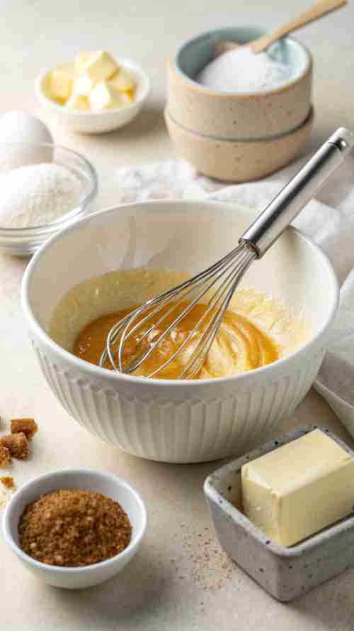 - In a large bowl, whisk melted butter, white sugar, and brown sugar until smooth. Add the eggs and vanilla extract, then mix until it looks creamy and shiny.
