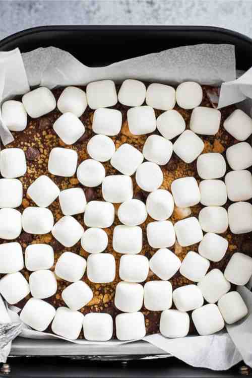 - Pour half of the brownie batter into the pan. Then sprinkle your graham cracker crumbs, marshmallows, and chocolate chips all over. Pour the rest of the brownie batter on top. It does not have to be perfect. The messy ones taste the best anyway.