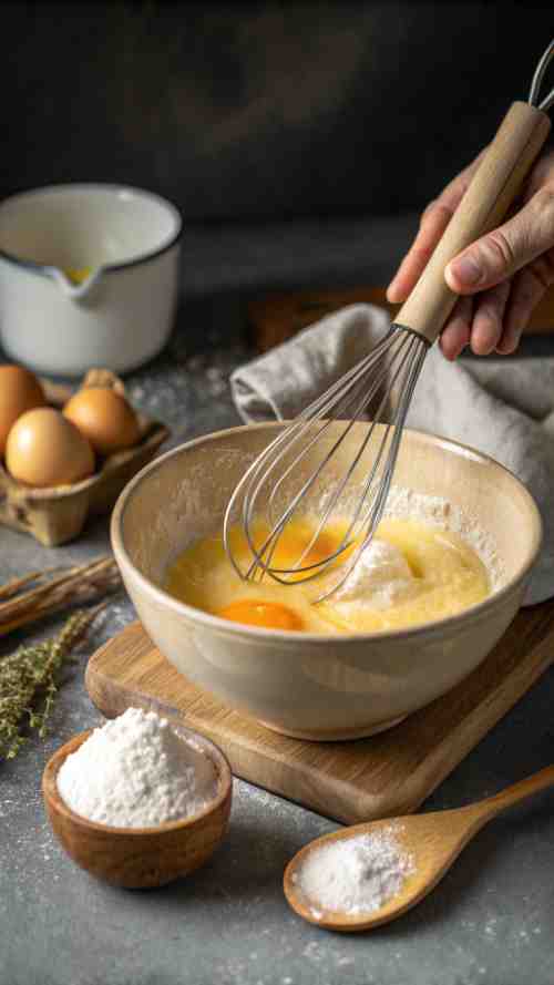 Now, in a big bowl, crack your eggs and add the sugar. Get your mixer out (or just use a hand whisk if you’re feeling strong), and whisk them together until they’re nice and fluffy. This step takes about 5 minutes if you’re using a hand mixer, or maybe 10 minutes if you’re doing it by hand (hello, arm workout!). You want the mixture to be light, fluffy, and pale. It should look a little thick too.