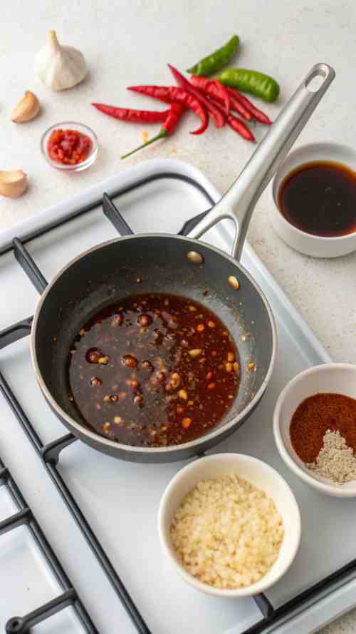- In a small pan, mix sweet chili sauce, soy sauce, honey, garlic, and rice vinegar. Warm it on low heat for 2 to 3 minutes until it gets a little thick.