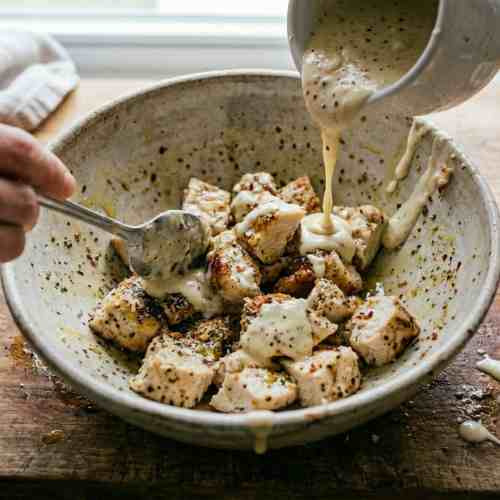 Pour the caesar dressing over the chicken. Stir until the chicken is creamy and well mixed.