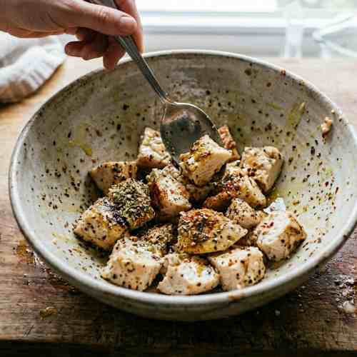 - Place chicken in a bowl and add olive oil, salt, and pepper