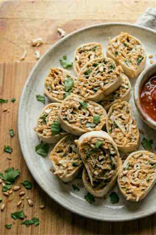 Arrange the pinwheels on a serving plate. Serve them right away or keep them chilled until ready to serve. These chicken enchilada pinwheels taste great cold and hold their shape well.
