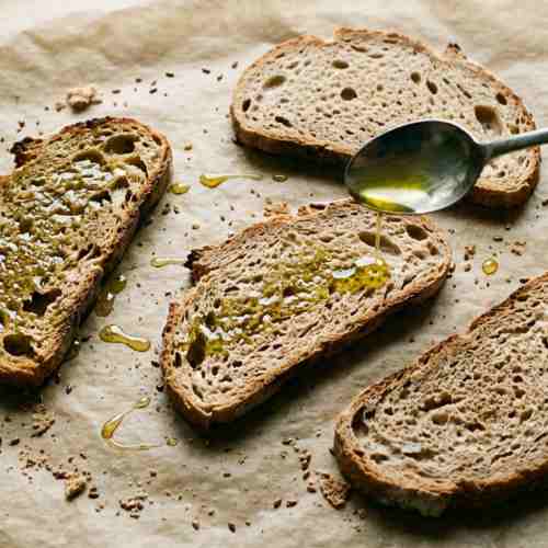 - Lay bread slices flat and drizzle olive oil evenly on each slice. Spread lightly to coat the surface.
