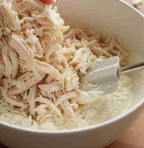 - Add the shredded chicken and fold it in gentle. I always spill a little and it is fine.