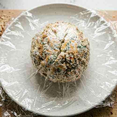 Wrap the cheese ball in plastic wrap and place it in the fridge for at least 1 hour. This helps it firm up and allows all the flavors to blend well.