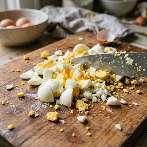 Peel the cooled eggs and place them in a bowl. Chop them into small pieces or mash them gently with a fork. Keep some small chunks for better texture.