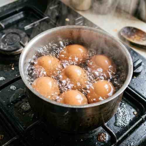 Place the eggs in a pot and cover them fully with water. Bring to a boil, then cook for about 10 to 12 minutes. Once done, move them to cold water so they cool down faster. This also helps make peeling easier.