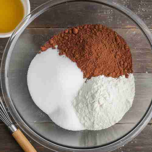 - In a big bowl, whisk together flour, sugar, cocoa powder, baking powder, and salt. Make sure everything is mixed well. I sometimes sneak a taste here and there, just to make sure it is chocolatey enough.