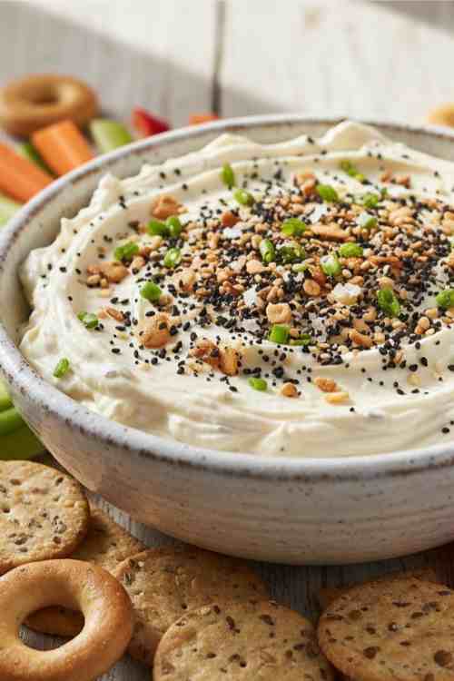 Transfer the dip to a serving bowl. Sprinkle extra everything bagel seasoning on top, and add optional garnishes like chopped chives or green onions for a pop of color.