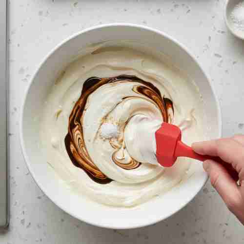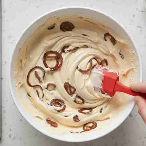 Let the onions cool for a few minutes. Then fold them into the creamy mixture. Stir gently so the onions are evenly spread. Taste a little and add more salt or pepper if you think it needs it.