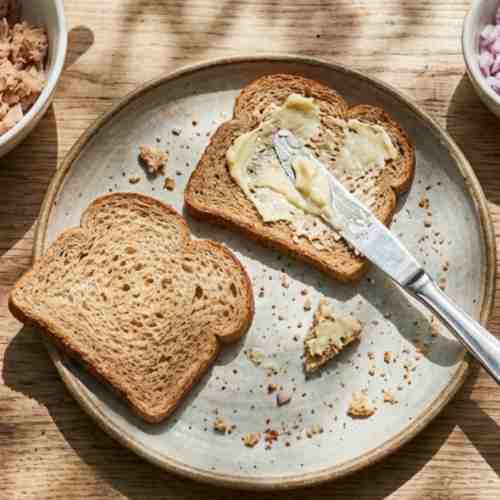 - Place two slices butter-side down. Add tuna mixture evenly over each slice and spread gently.