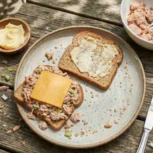 Place a slice of cheese on top of the tuna mixture. Make sure the cheese covers most of the surface so it melts evenly. Cover with another slice of bread, keeping the buttered side facing outward.