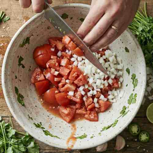 - Finely chop onion and jalapeños. Add them to the bowl with tomatoes.
