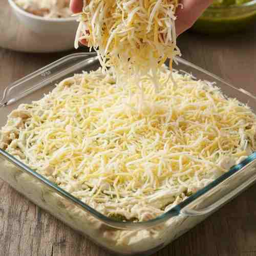 - Grease a 9 by 9 inch baking dish. Pour the mixture in and spread it evenly. Sprinkle the remaining cheese on top.