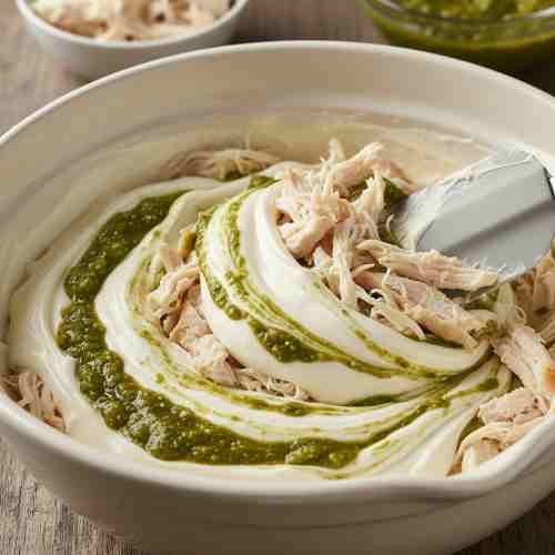 - Mix the cream cheese, sour cream, and spices a day before. Keep it in the fridge so that when you combine it with chicken and salsa verde, it is quick and smooth.
