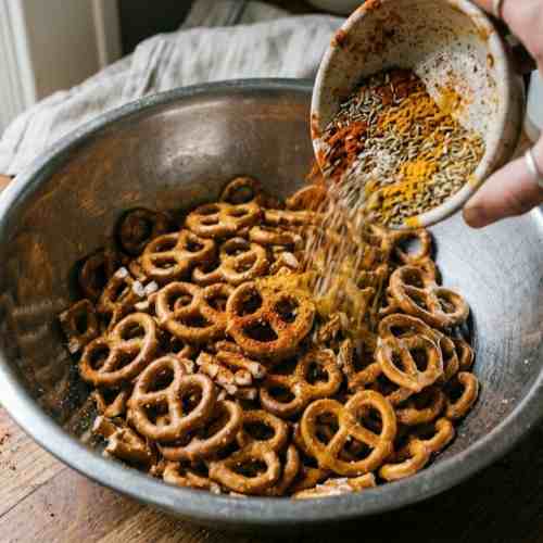 - Gradually pour the seasoning mixture over the pretzels, tossing gently as you pour to ensure even distribution. Continue mixing until all pretzels are fully coated with the seasoned oil.
