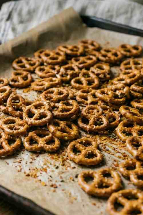 Line a baking tray with parchment paper and spread the pretzels in a single, even layer. Avoid overcrowding the tray.