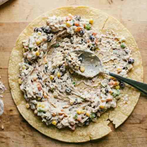 - Lay tortillas flat on a clean surface. Divide the filling evenly between them.