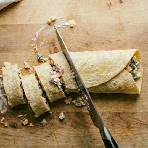 Starting from one edge, carefully roll the tortilla into a tight log. Apply gentle pressure as you roll to keep the shape firm and compact.