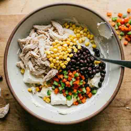 - Add shredded chicken, shredded cheese, black beans, corn, diced bell pepper, and green onions. Fold everything together until the filling is thick and evenly mixed.