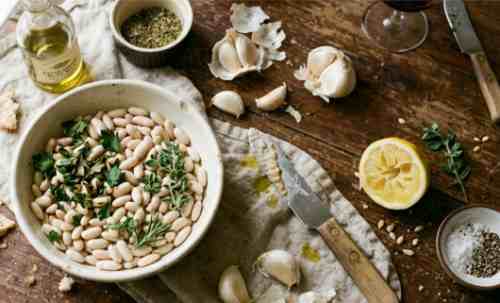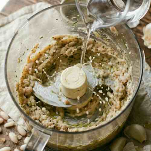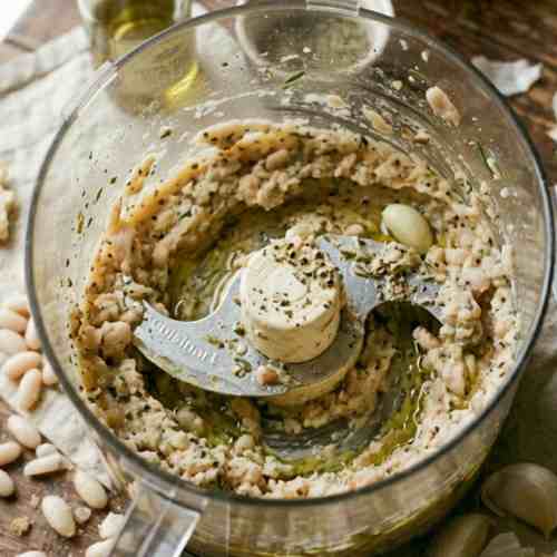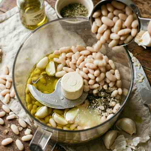 - Add the beans to a blender or food processor along with olive oil, garlic, lemon juice, salt, pepper, and oregano.