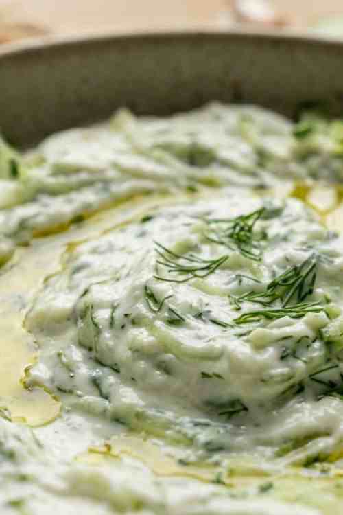- Make sure the cucumber and herbs are spread throughout the dip