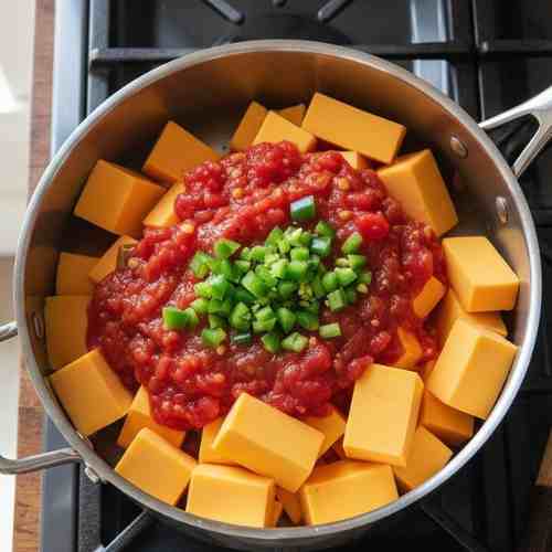 - Place the cubed cheese, the undrained Rotel tomatoes, and the diced jalapeño in a medium saucepan.